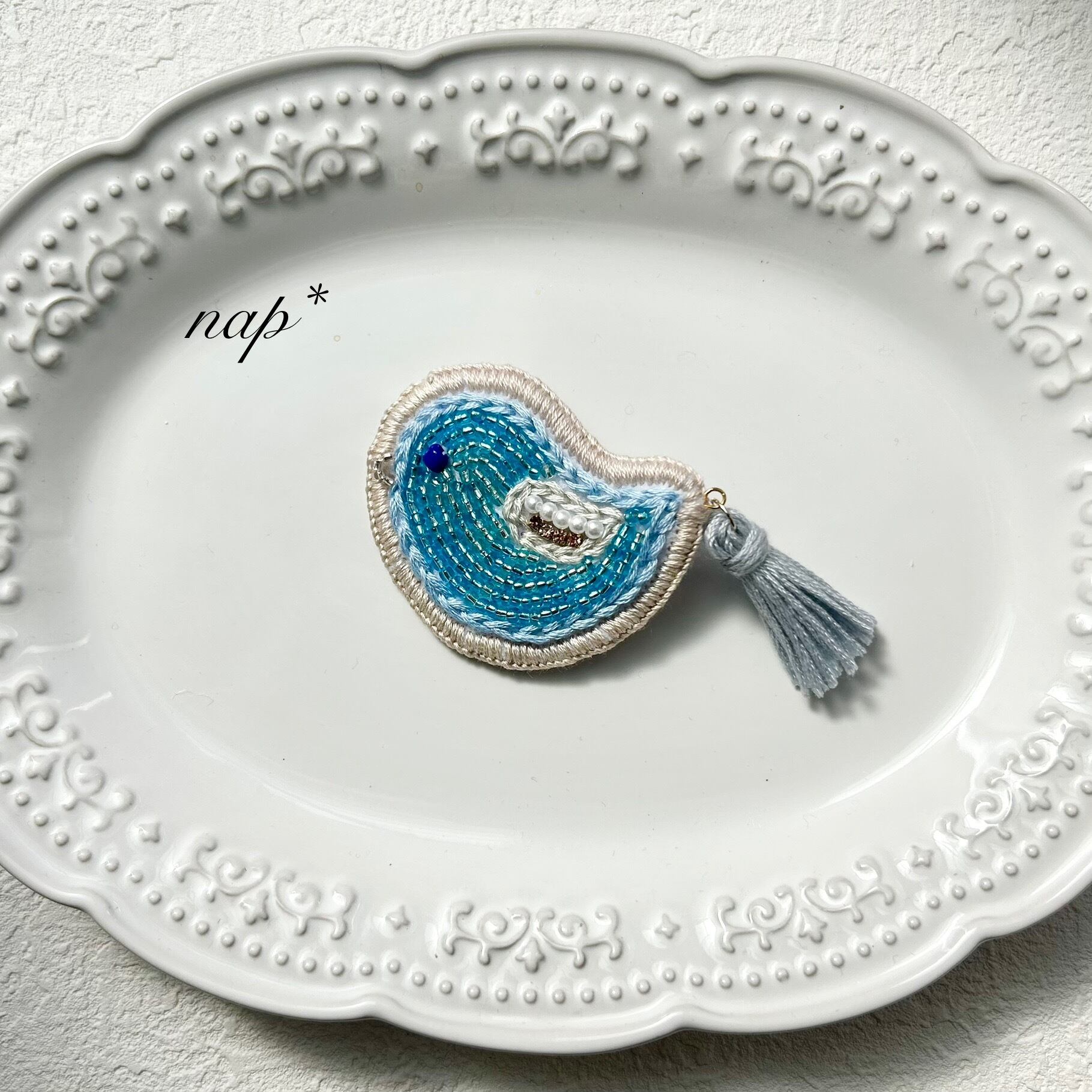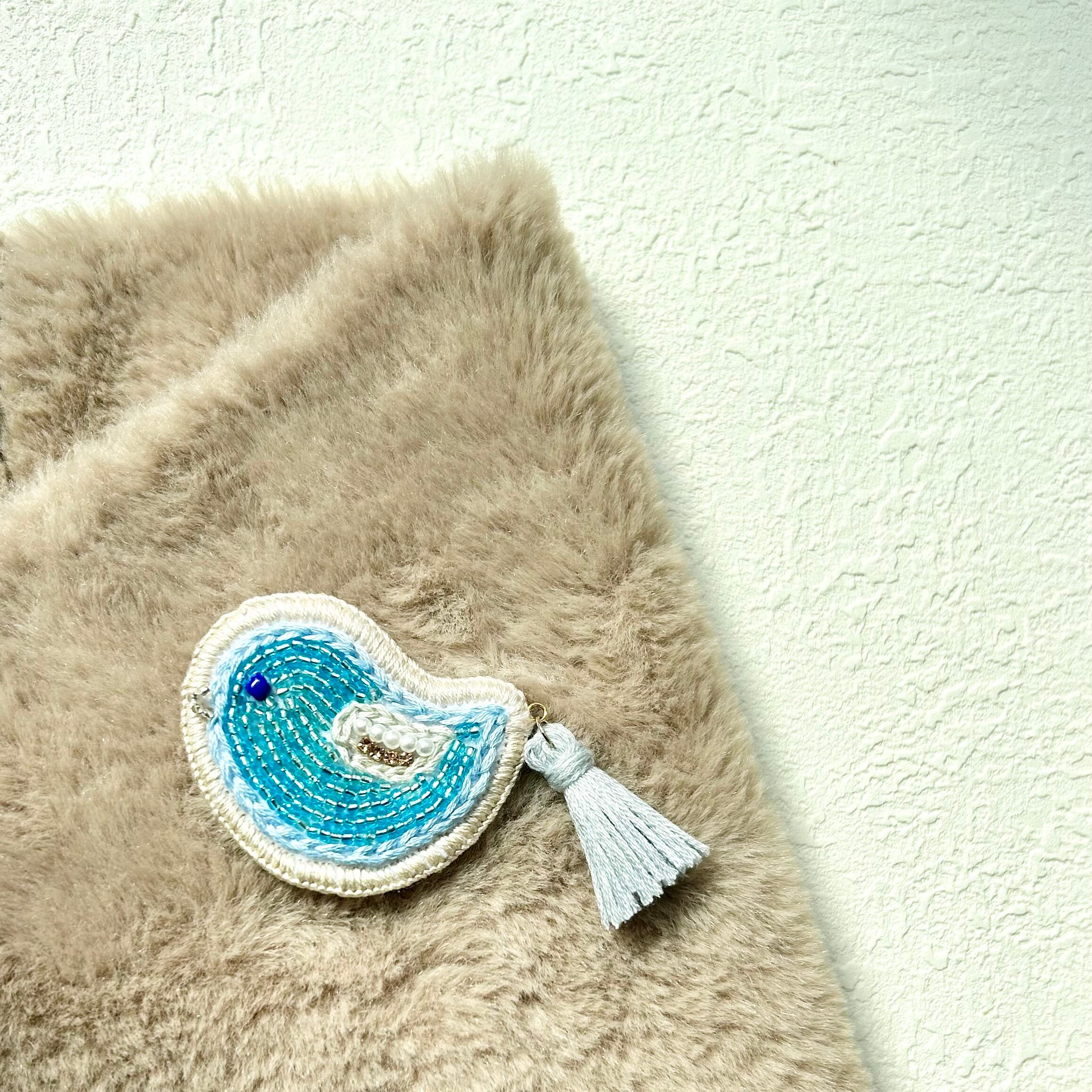ガラスビーズ*ブルーの小鳥*タッセル付き刺繍ブローチ|ハンドメイド