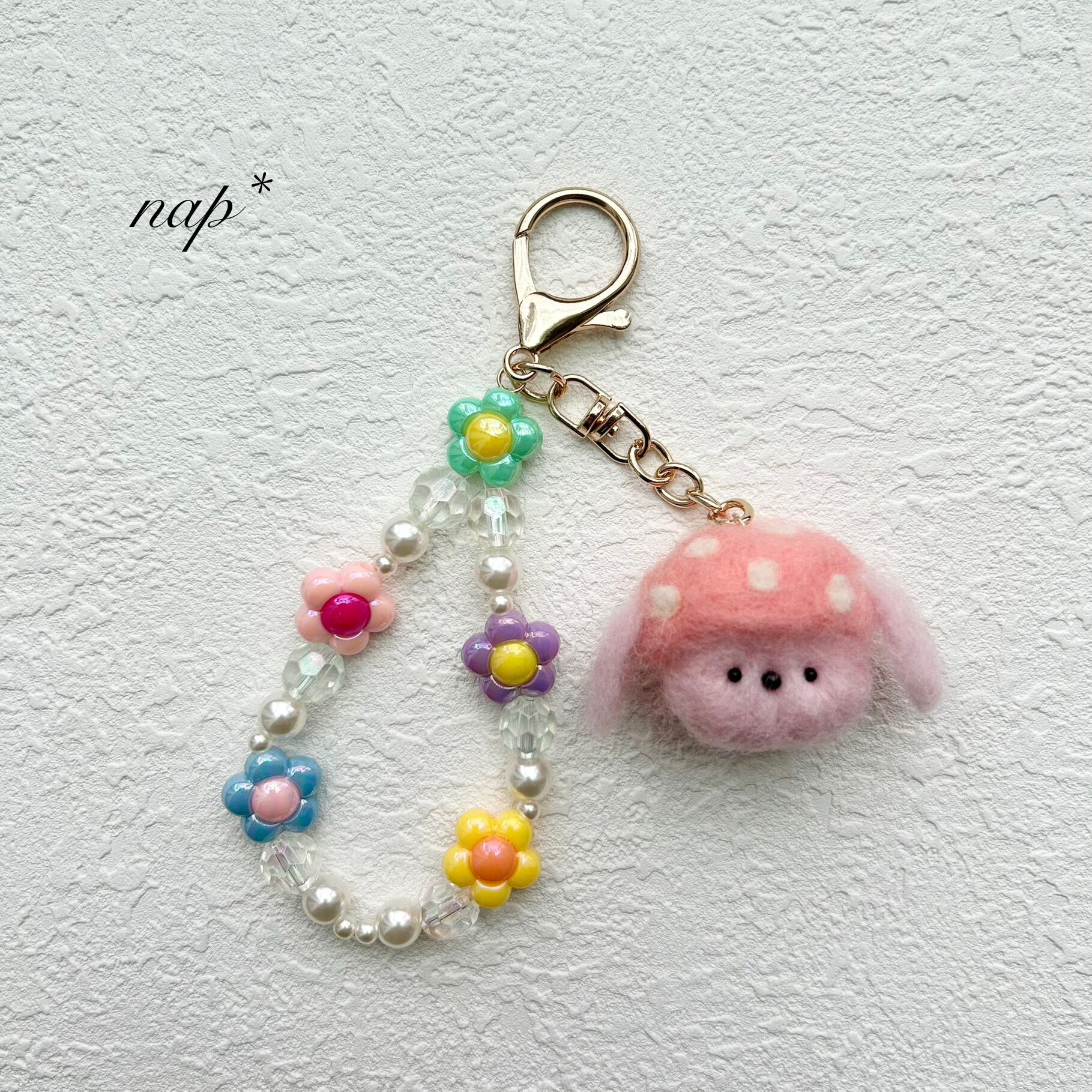 ふんわり羊毛フェルト×お花ビーズ|ハンドメイドストラップ