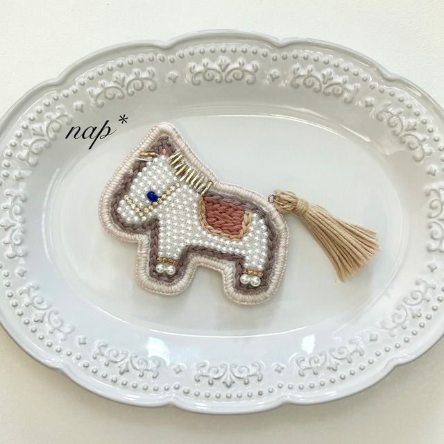 • きらめくポニーのビーズ刺繍ブローチ*タッセル付き|ハンドメイド